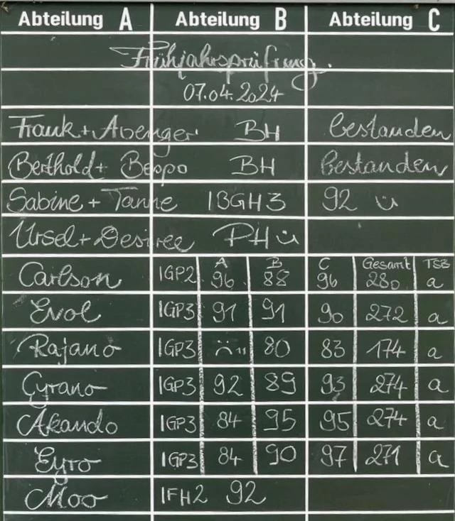 | Hund | Arkando vom Sterzbach | Rüde | Boxer | IGP3 | 84 | 95 | 95 | a | |